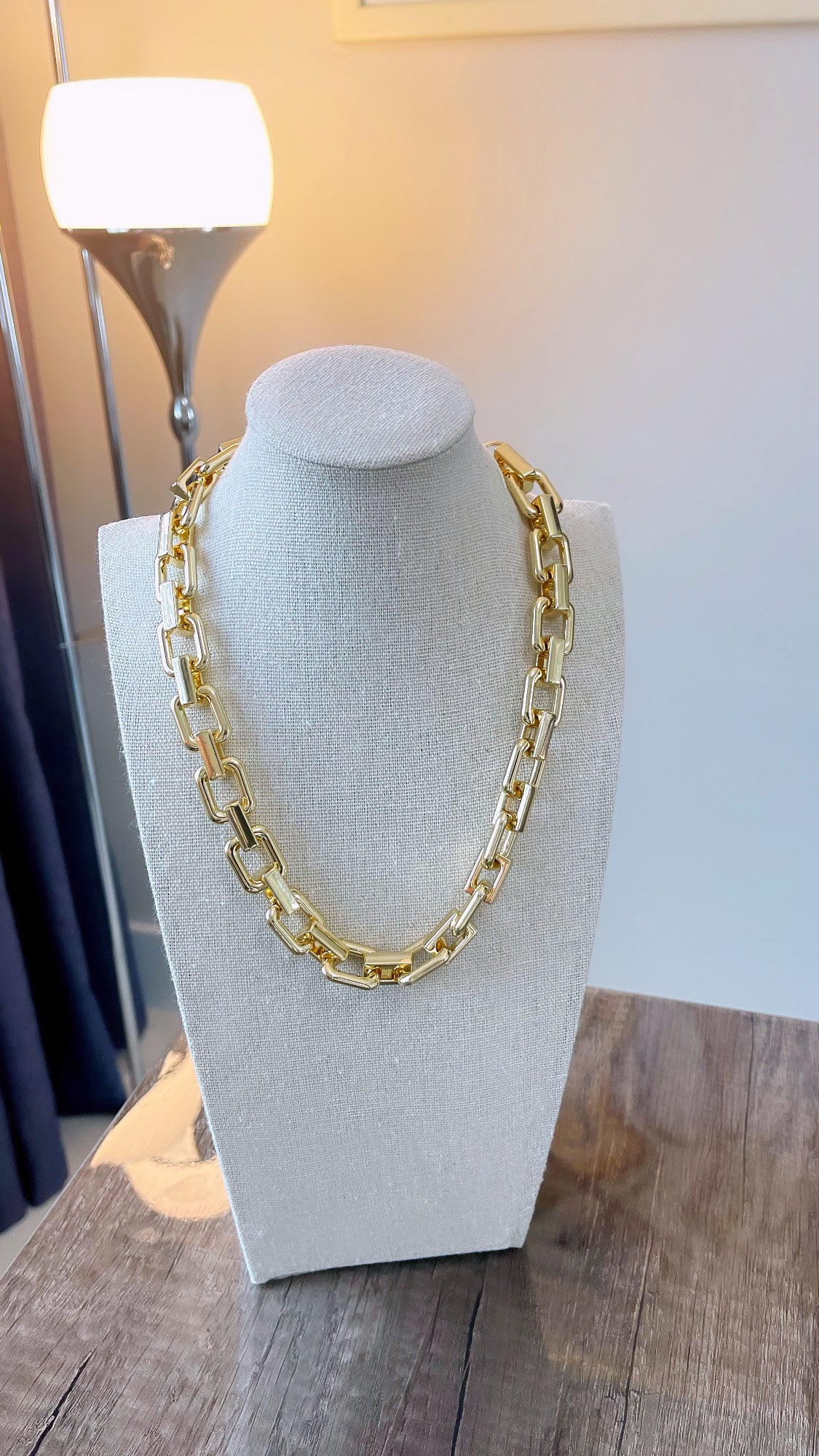 Plated Gold 14MM Squared Link Choker Necklace. The 14mm necklace chain is 43cm + 4cm extender. Closure Type: Lobster (17'"+1.5" extender)