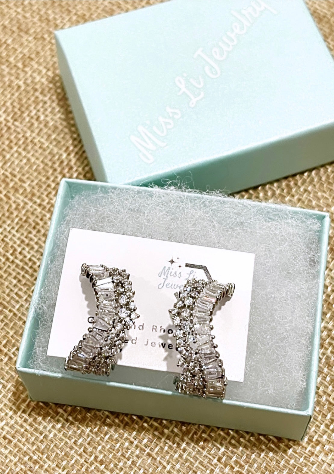Rhodium Baguette Zirconia and Pave Rhodium Hoop. Half Hoop with 20mm, fully studded with micro and baguette zirconia.