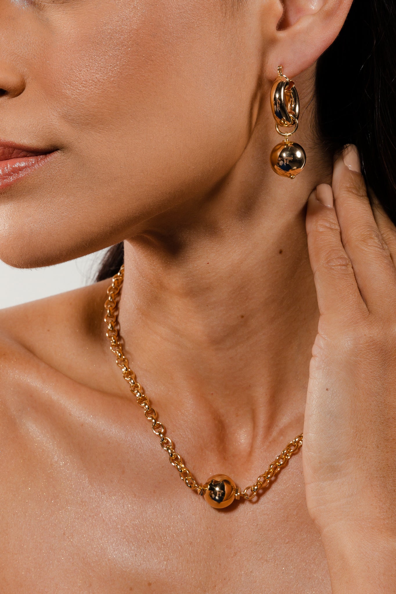 Gold Plated Dangle Ball 2 in 1 Hoop Earring. 37mm earring, where 19mm is the hoop an 18 is the dangle Ball. You can remove the dangle and wear just the hoop as another option of style. Closure: Hinged Clip