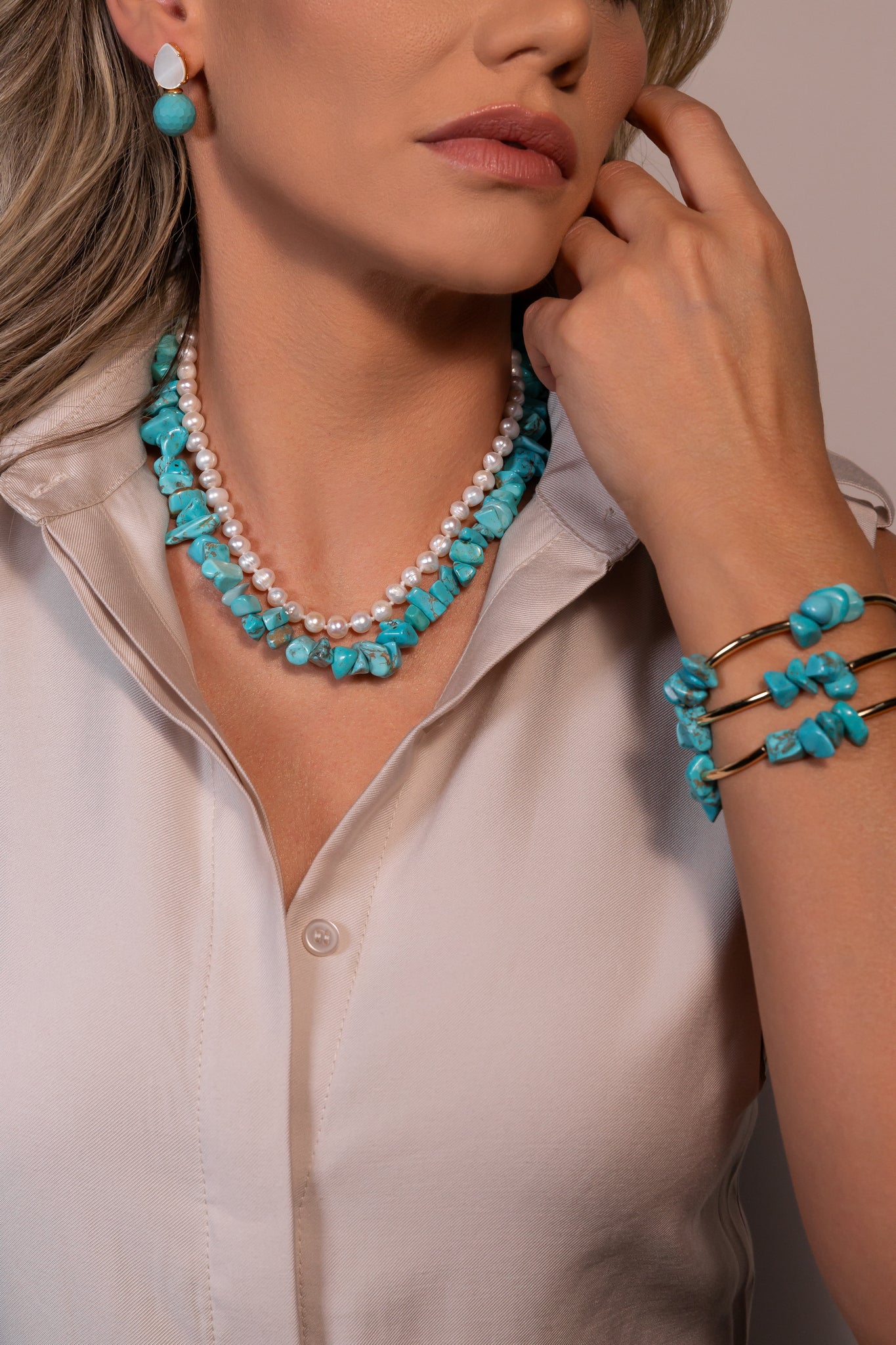 Gold Plated Gemstone Ball and Mother Pearl Earring. The earring is 29mm. Mother Pearl base with Ball Real Gemstone. Gemstone Options: Blue Agate, Turquoise or Rose Quartz