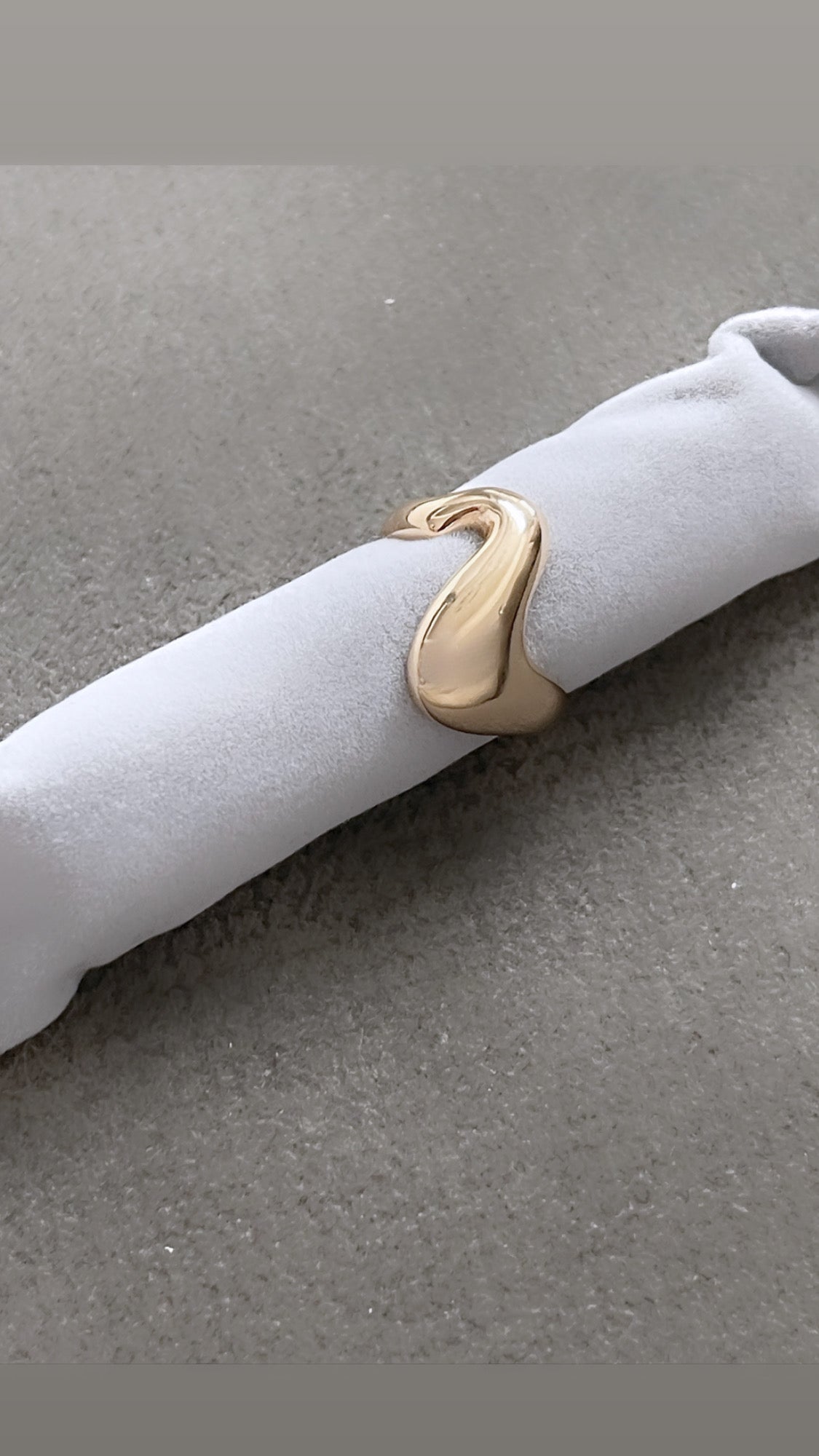 Gold Plated Glossy Organic Open Ring. It is an organic ring in a wave glossy shape, with an opening on the bottom that allows to adjust ring to the finger, and fits all sizes 6 and up to 9. Picture reference: middle finger