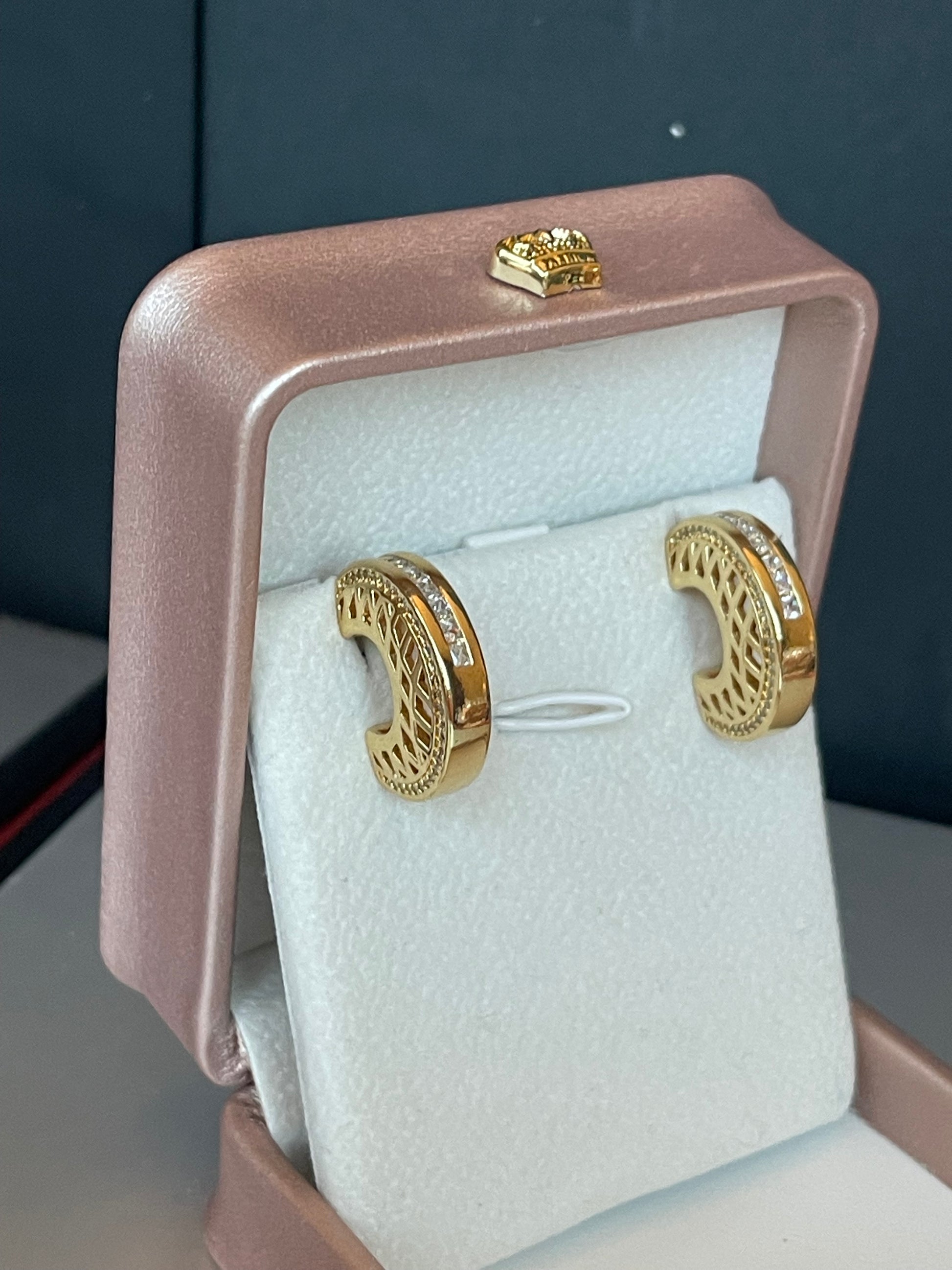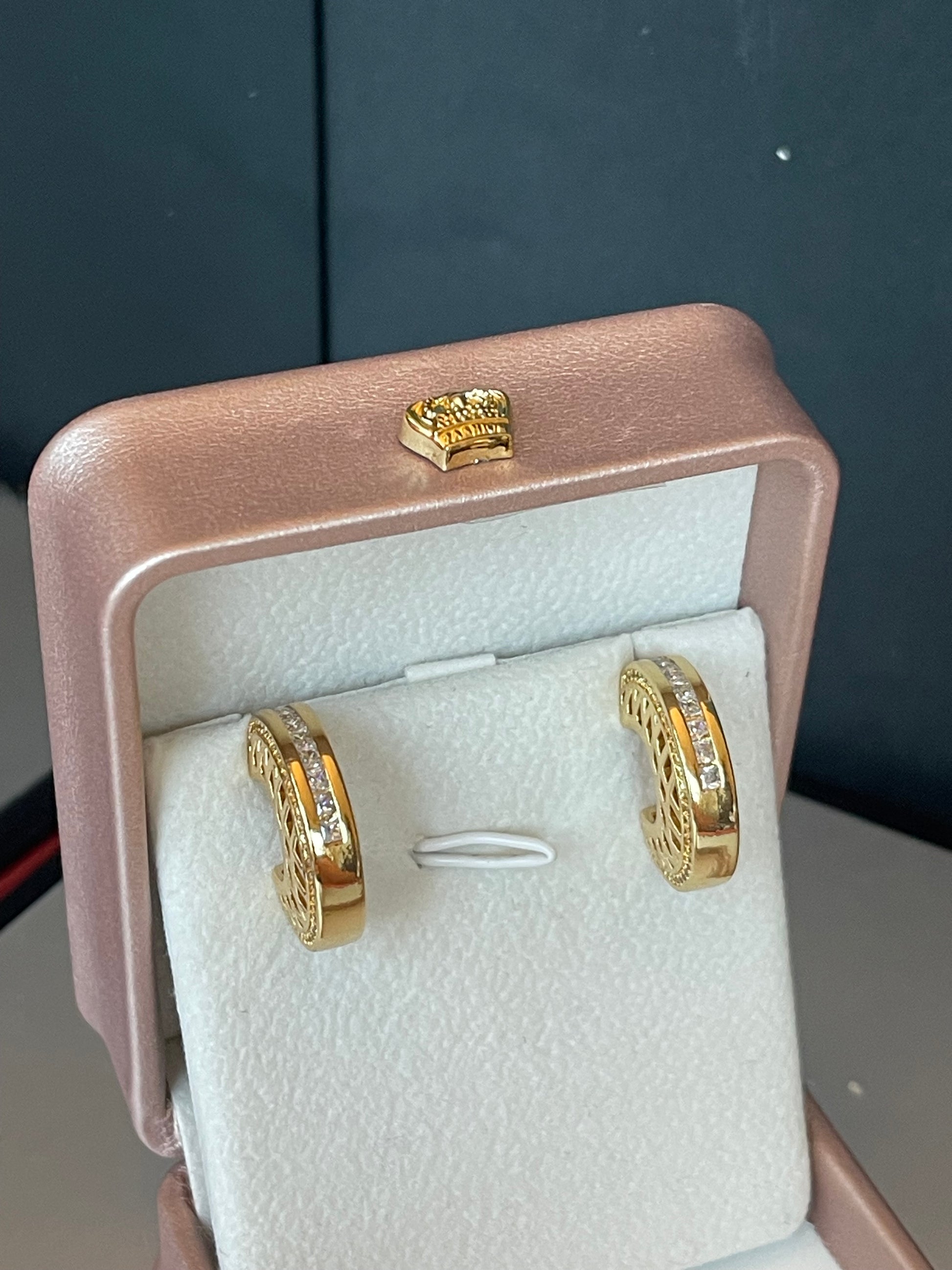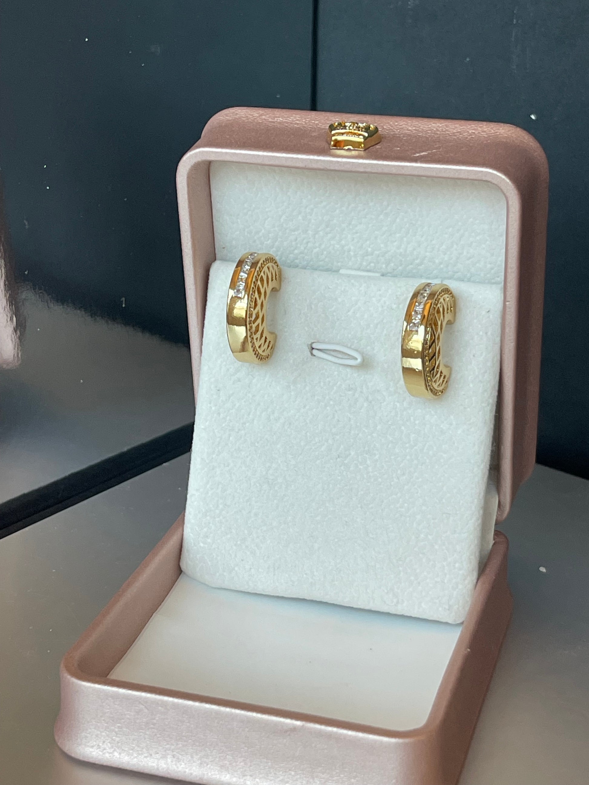 Gold Plated Lace Zirconia Carre Earring Hoop. The hoop is 22mm. In the front a line of zirconias carre, looking sideways a lace abb with micro zirconia.