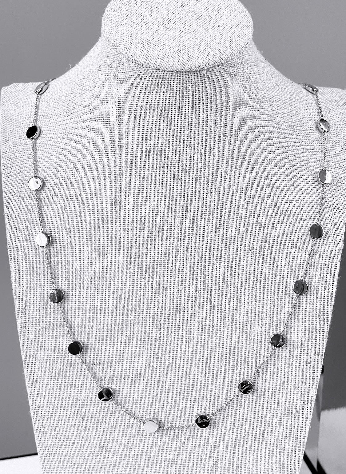 Plated Rhodium Long Glossy Coins Necklace. The necklace chain is 80cm.