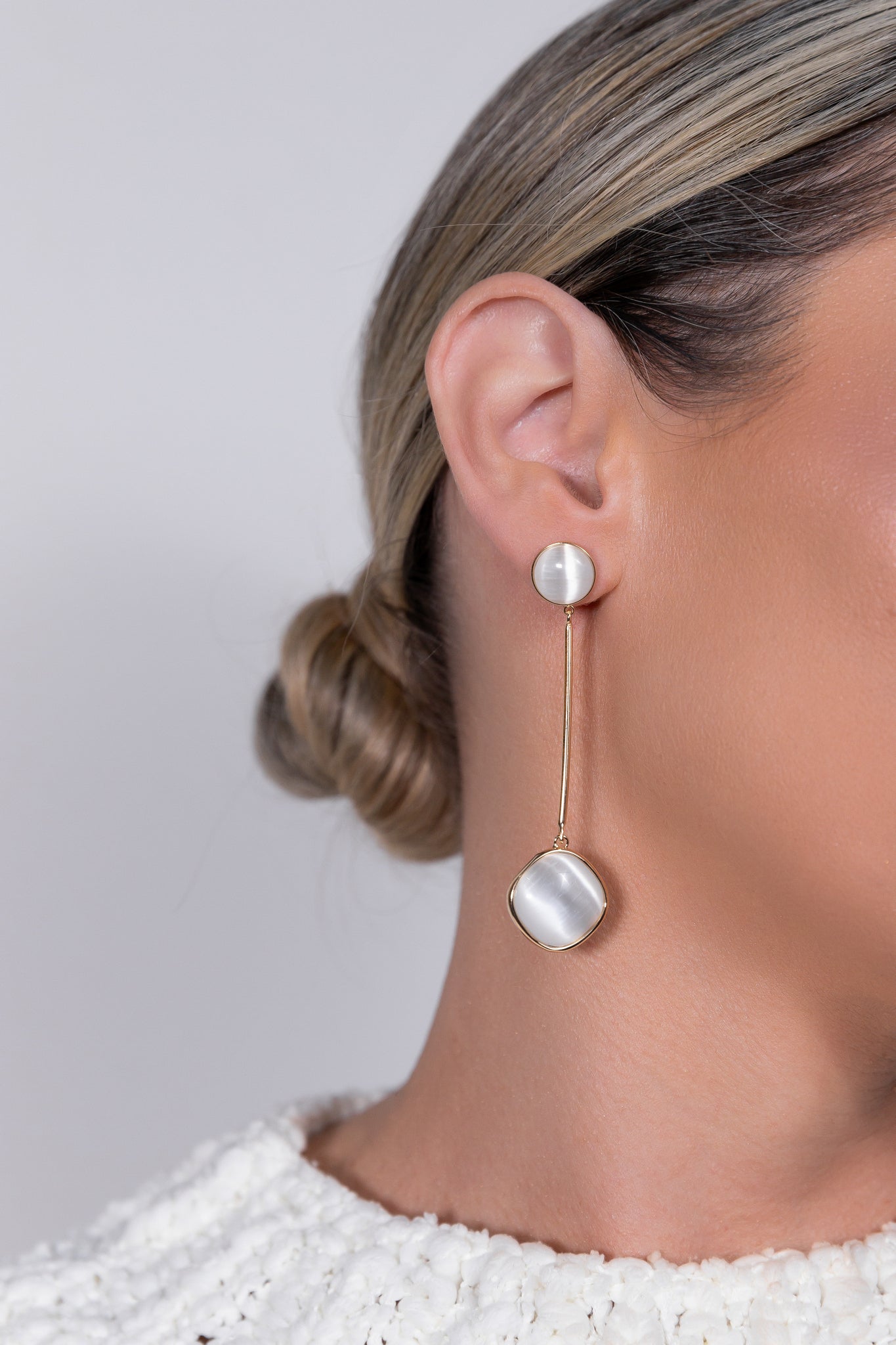 Plated Rhodium Pendulum Mother Pearl Drop Earrings. The earring is 80mm, with 35mm top base, 33mm dangle bottom part.