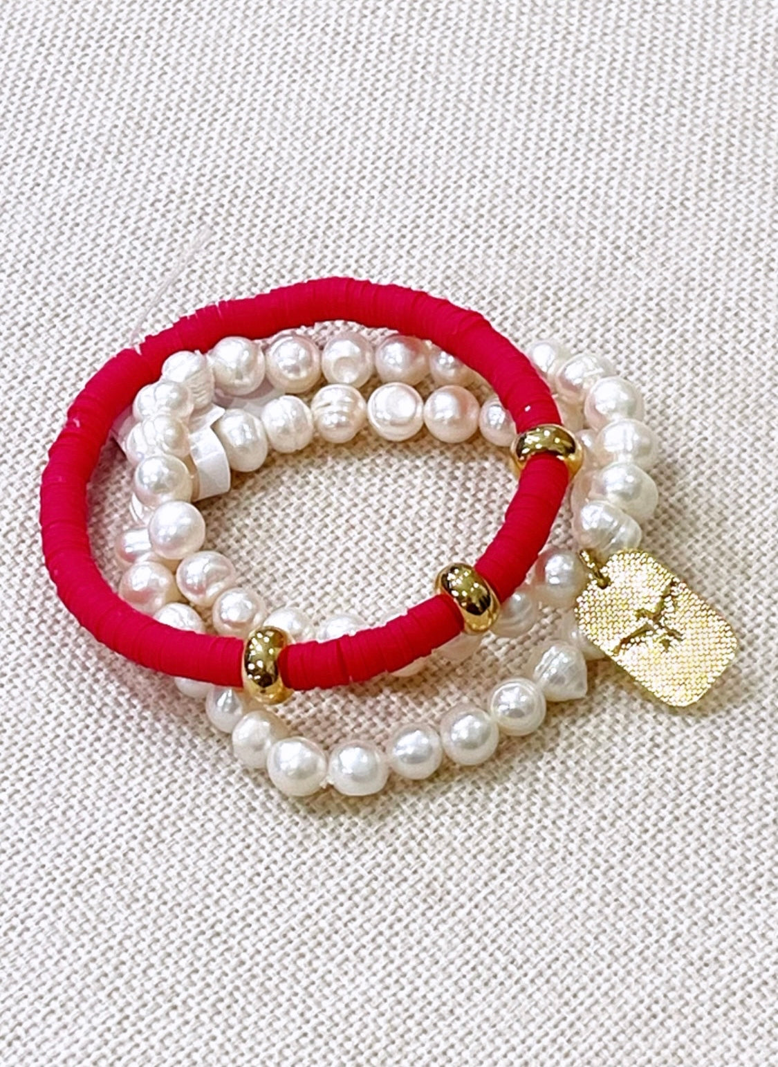 Gold Plated Pink Polymer Clay and Pearl Bracelet. The Clay Bracelet have 3 sleek gold separator and the Pearl Bracelet has a holy spirit pendant. Adjustable stretch out fit.