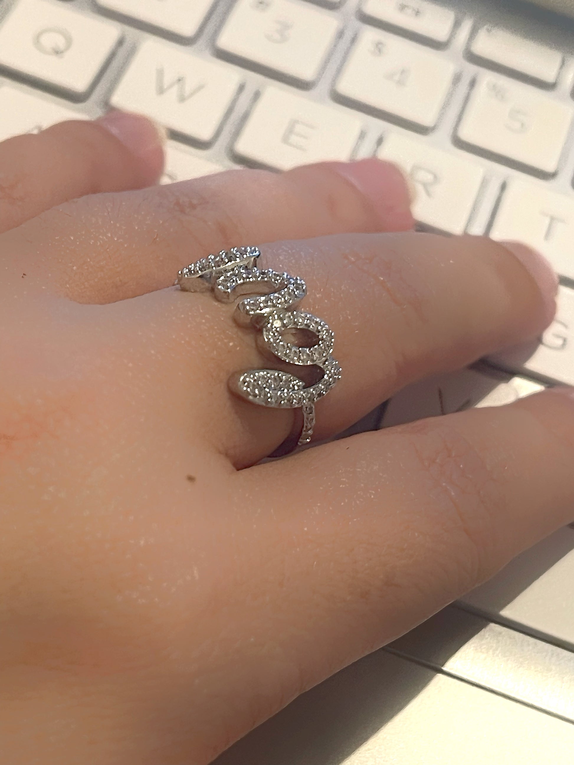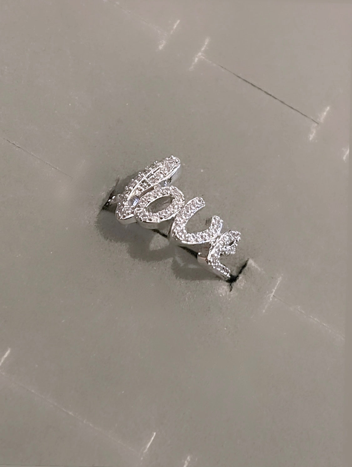 Rhodium Plated Pave Cursive Writing "Love". The sizes are based on the US chart. Picture Reference: Middle Finger.