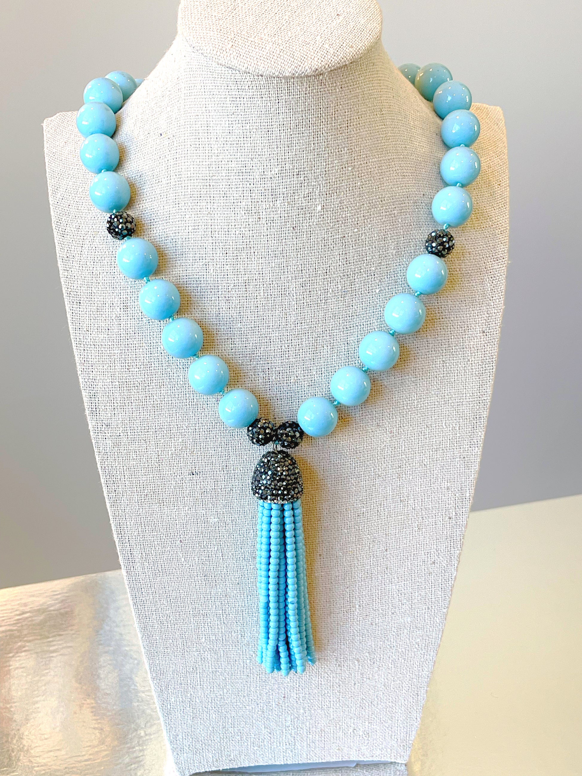 Plated Rhodium Tassel Blue Provence 14MM Glass Pearl Necklace. The necklace is 51cm and the pendant is 90mm.