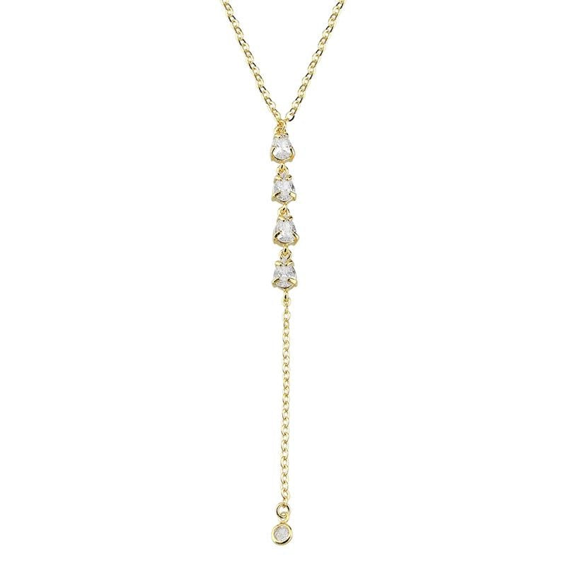 Gold Plated Tie Zirconia Drops Necklace. The necklace chain is 44cm and the Zirconia tie chain is 10cm. The zirconia drops are 7mm each.