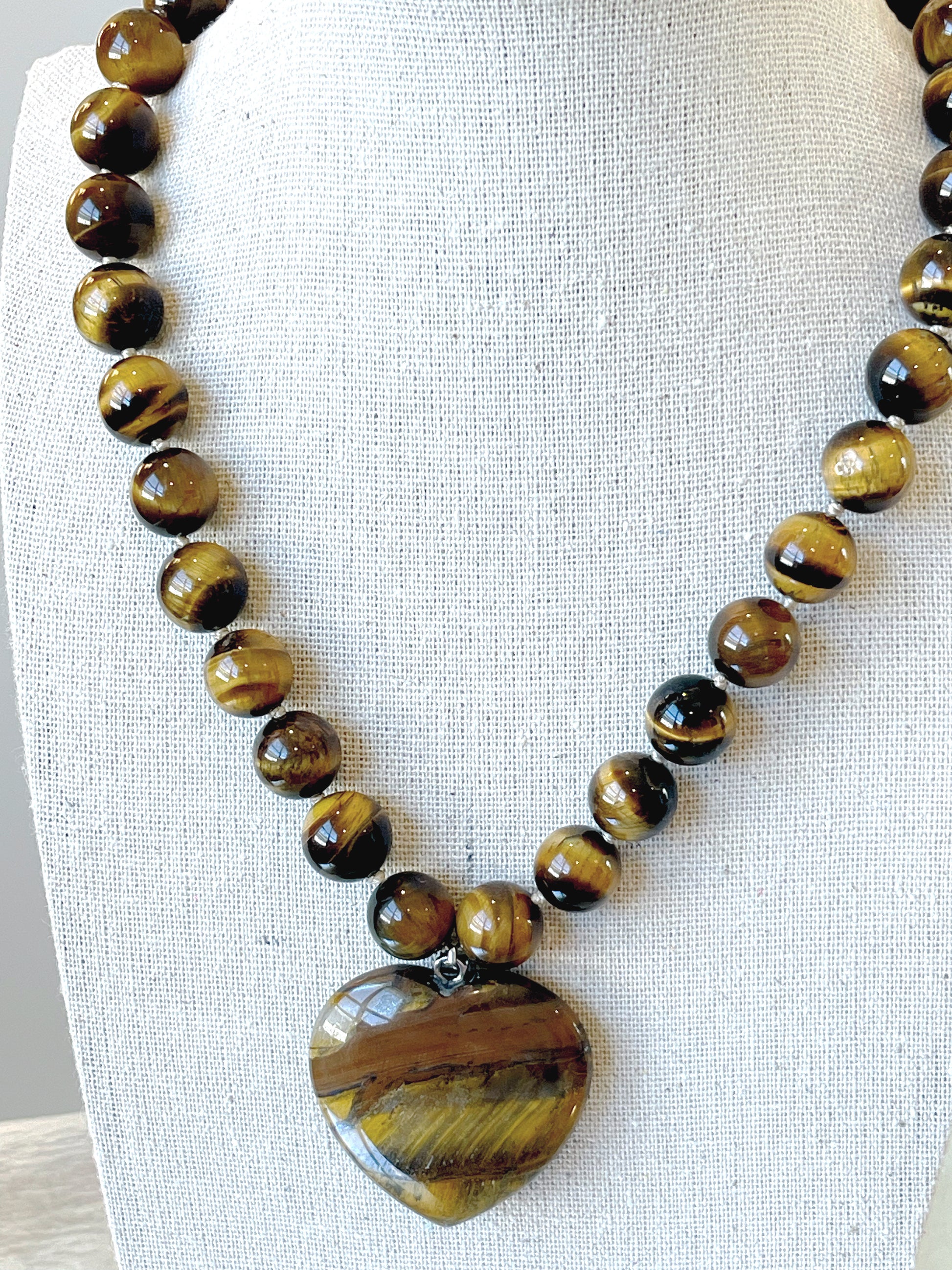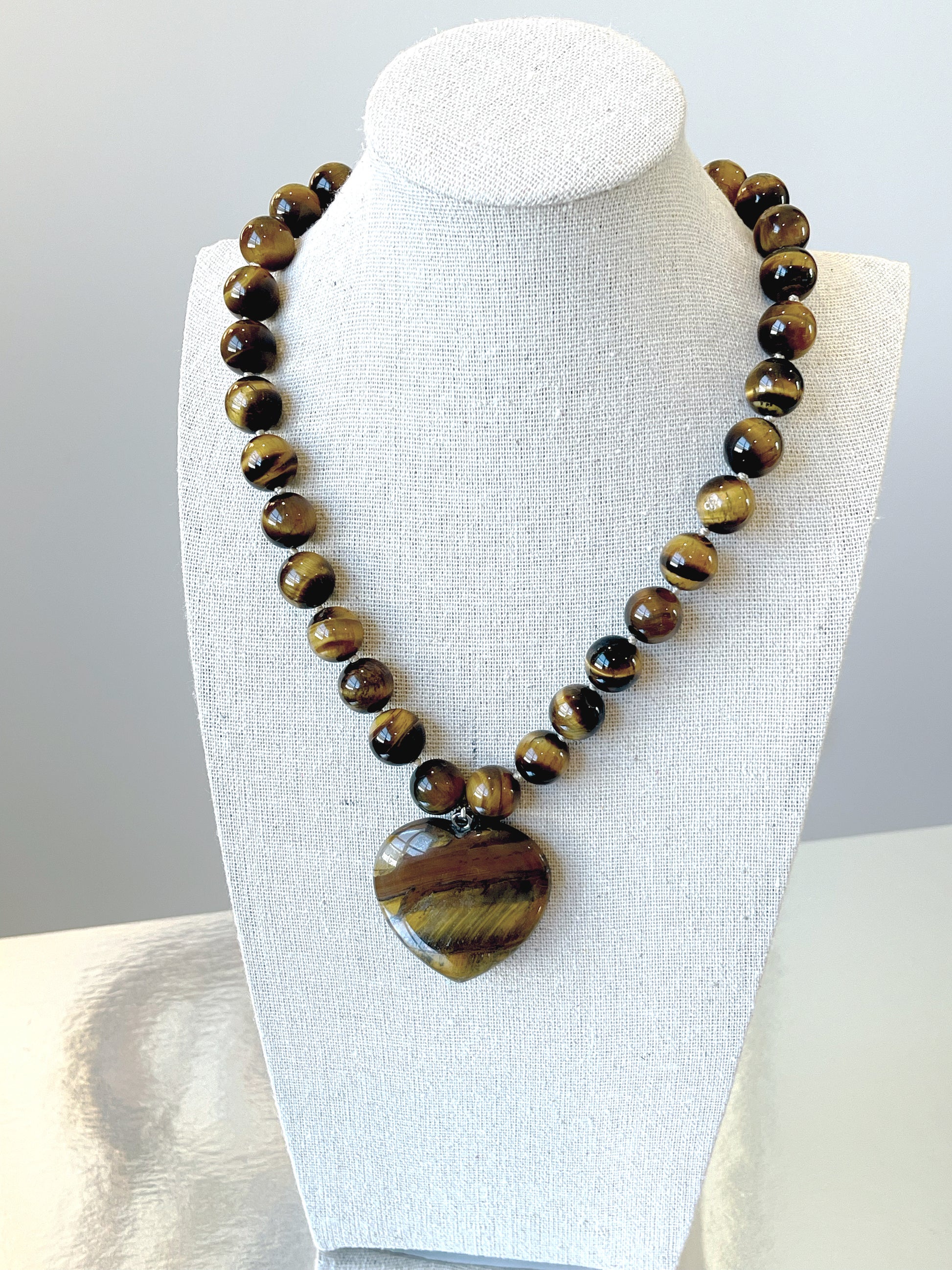 Plated Rhodium Tyger Eye 12MM Heart Necklace 45cm. Tiger Eye Heart Pendant 40mm