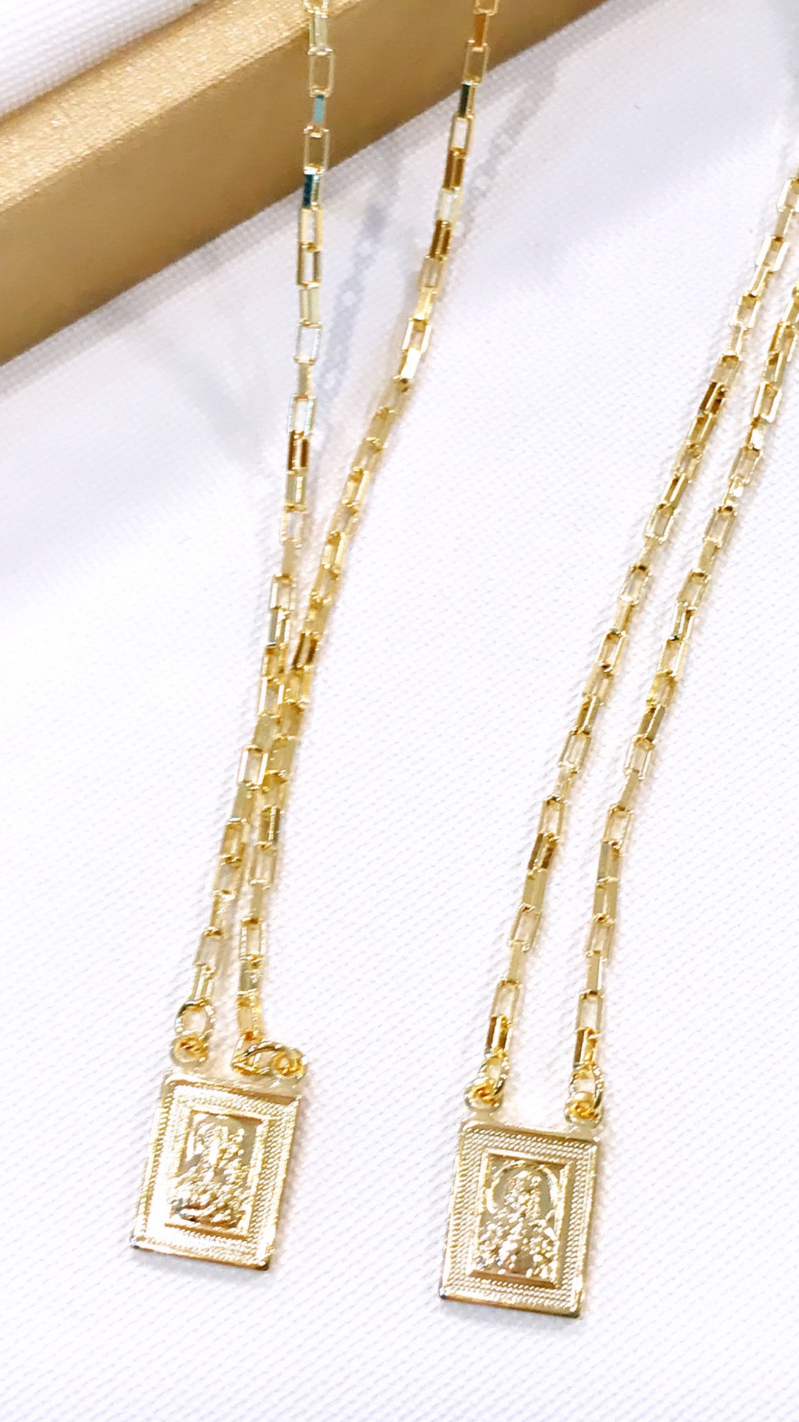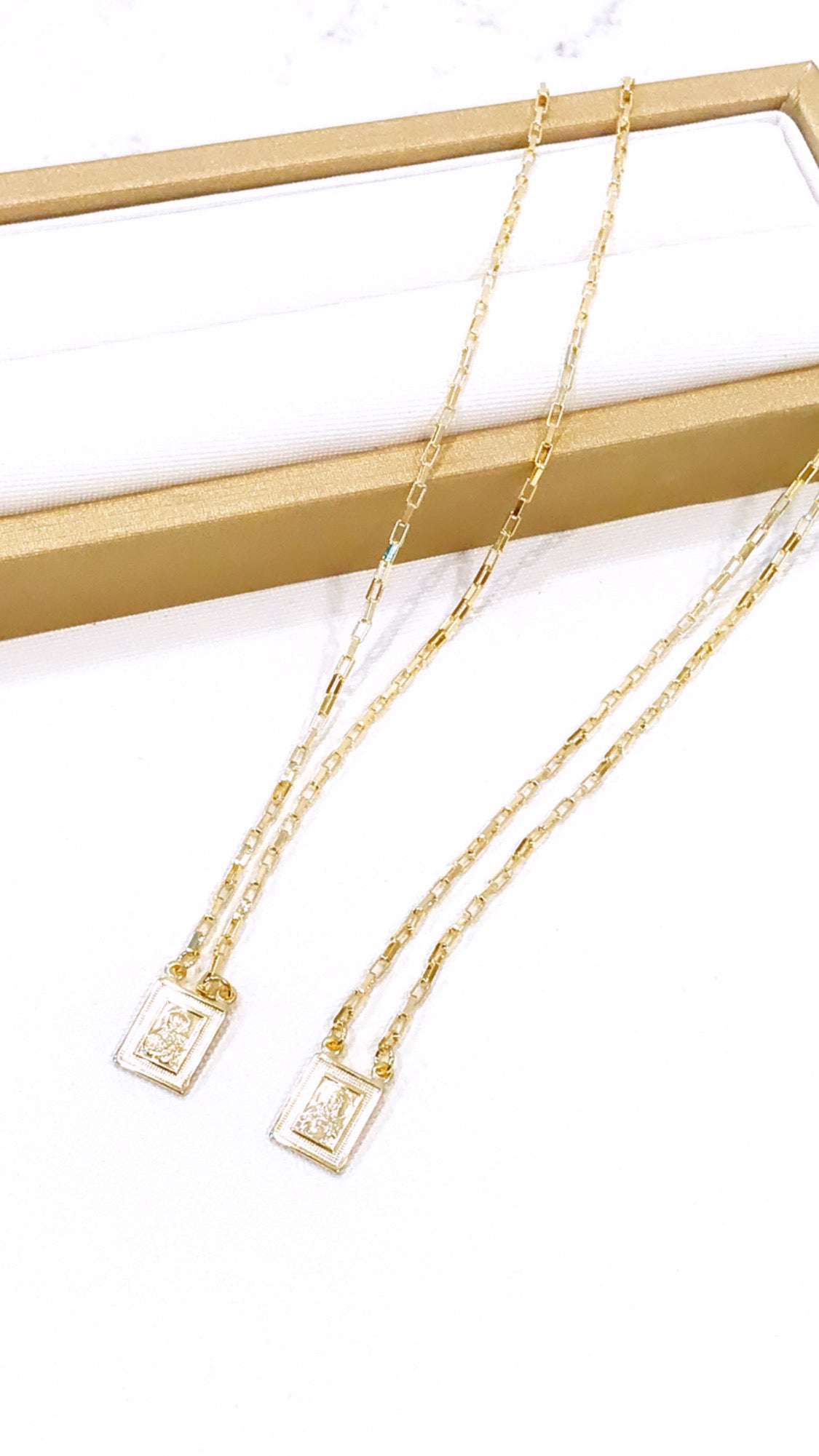 Gold Plated Virgin Mary and Jesus Scapular. The necklace is 45CM long, and the pendant is delicate, about 7MM only.