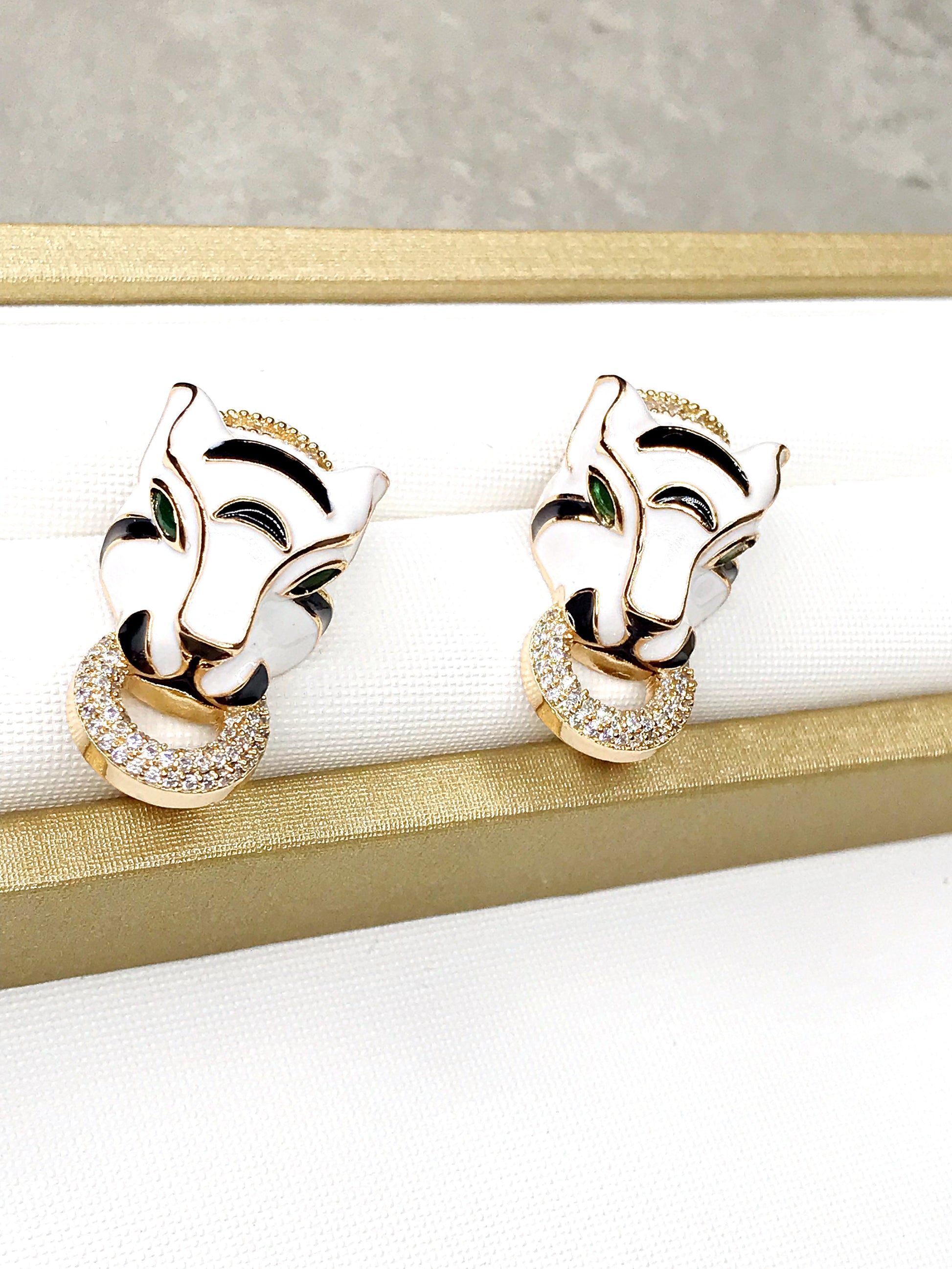 Gold Plated White Enamel Panther Earring. Studded with zirconia. 30x14MM
