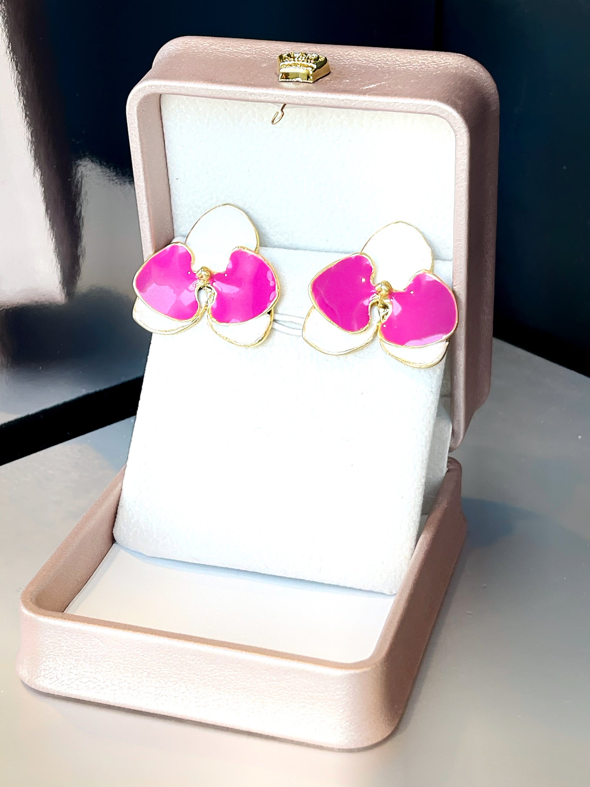 Gold Plated White & Fuchsia Enamel Flower Earring. 29x30mm