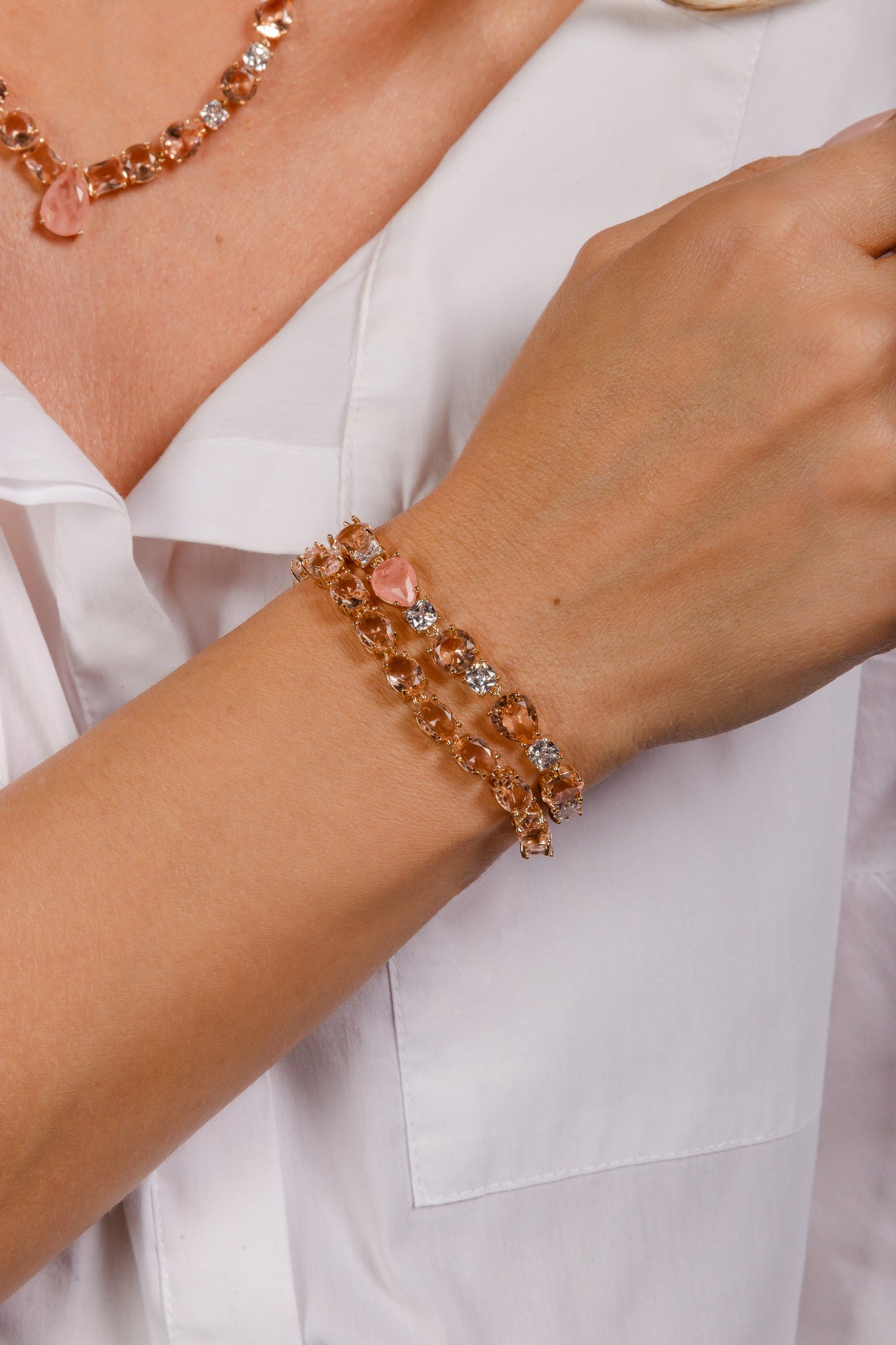 Gold Plated Oval Morganite Zirconia Bracelet. Every oval zirconia is 7mm wide in a 24cm box chain Adjustable slide closure. Zirconia LabGem to have a brighter finishing with a peach undertone.