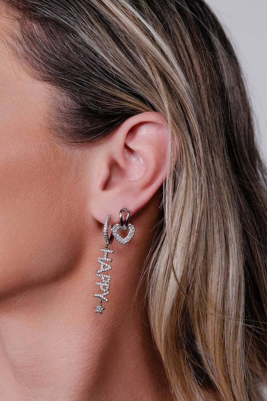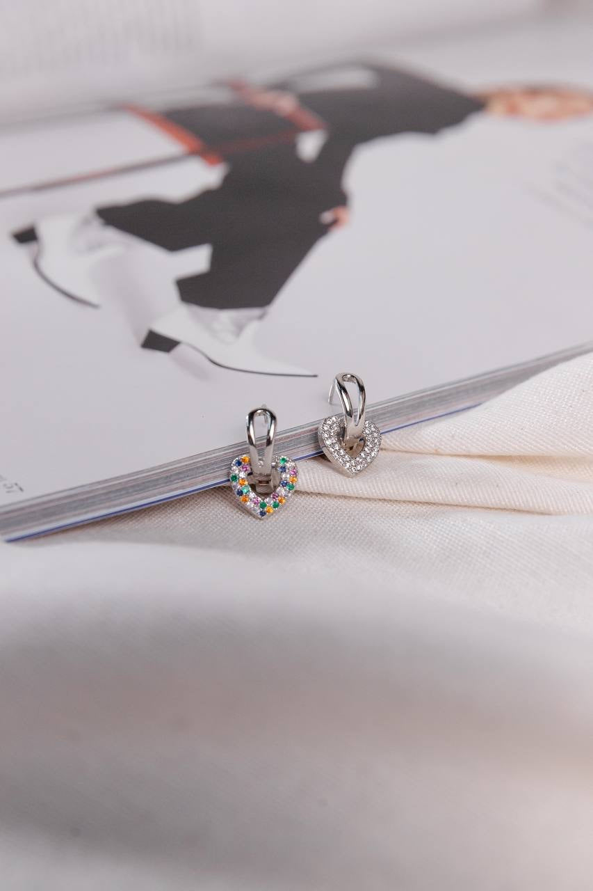 Rhodium Petit 2 in 1 Flat Heart Rhodium Hoop. Hoop is 13mm, and pave heart fully studded with micro zirconia is 11mm and can be removed. Use as a earring dangle or as a necklace pendant.